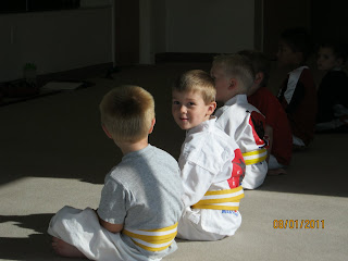 Well Karate started for Easton about the middle of July and he couldn't be more excited about it. He loves it and loves his Sensei Josh Durbin. His first class went really well. He is actually right up there with the other boys that have already been there for a while so we were so glad. The first day he learned about 10 blocks, 2 different kicks and a set of punches called Punching Kata One. The next time at class Sensei asked him which ones he remembered and he remembered all of them! That's when we knew he was really into this and we got really excited for him! His first belt test was coming up in 3 weeks so we did everything we could to help him practice and remember all the moves and blocks. This last Friday was the belt test and East did so good! He advanced to a yellow belt after only 3 weeks! We are so proud of him!! He probably could have skipped the yellow and tested for the orange but we wanted him to have a ceremony for each belt, so next time he will be testing for the orange belt. Last night at class they learned the Punching Kata Two and it is a little more intense but this morning I asked him if he remembered it and he did! We are just so glad that he is getting it and loves it so much! Oh and if your wondering, yes, we are watching karate kid at least once a day. He's got to act out the part ya know!! And if you want to see some crazy good karate moves check out his Sensei Josh Durbin on you tube. He is amazing!!